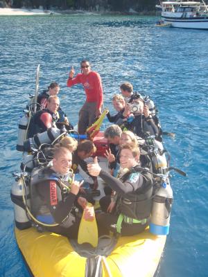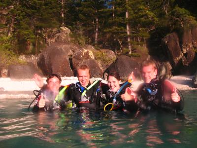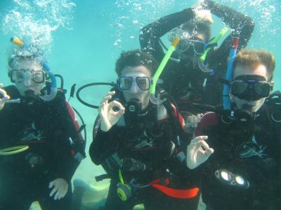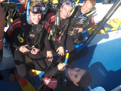 Fuer uns vier auf dem Bild ist es mehr oder weniger der erste richtige Tauchgang im offenen Meer.