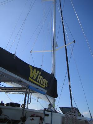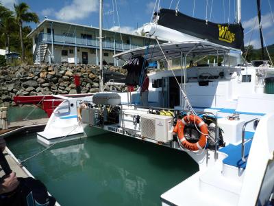 Und zwar auf diesem schmucken Katamaran mit dem Namen Wings Two.